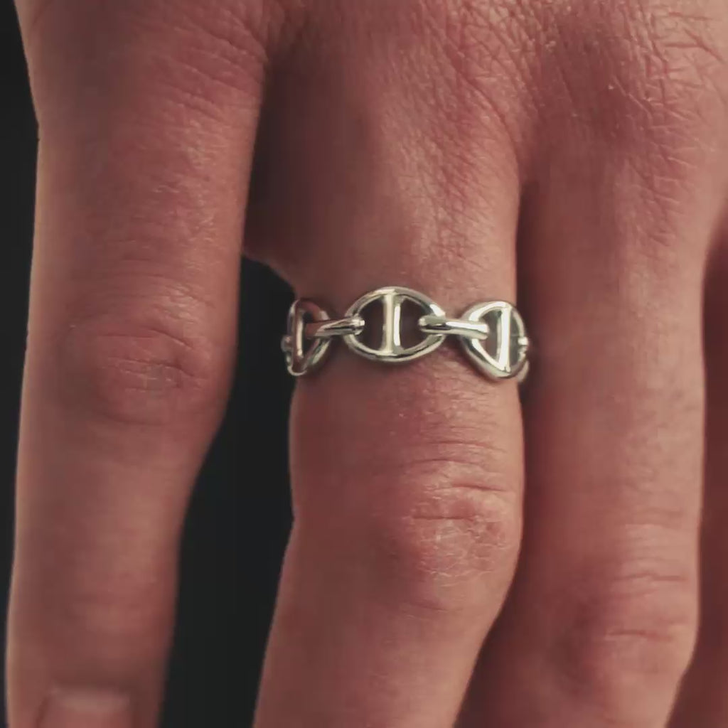Anchor Białe Złoto to pierścień inspirowany klasycznym splotem łańcucha typu anchor. Każde ogniwo zostało odwzorowane w metalu i połączone w zamkniętą formę, tworząc minimalistyczny, surowy wzór. Powierzchnia pierścienia jest gładka i wypolerowana, co nadaje mu nowoczesny wygląd.