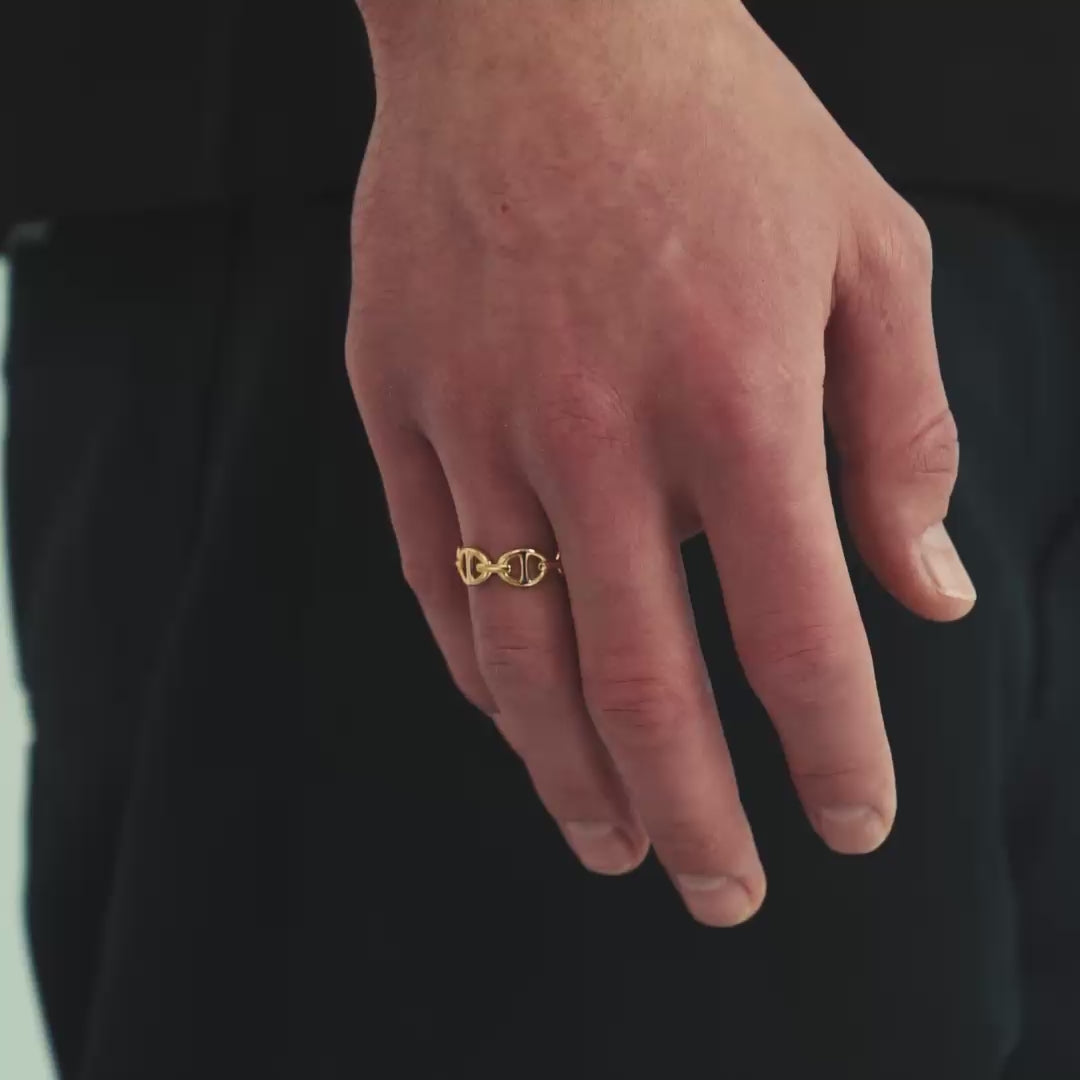 Anchor Złoto to pierścień inspirowany splotem łańcucha typu anchor, zamkniętym w formie pierścienia. Każde ogniwo zostało dokładnie odwzorowane, co tworzy wyraźną, trójwymiarową strukturę. Prosty projekt i solidna forma nadają mu uniwersalny charakter.