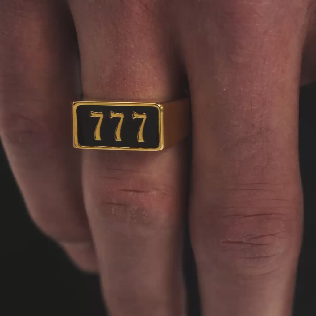 Lucky 777 Złoto to sygnet o wyważonych proporcjach i czystym wykończeniu. Cyfry „777” zostały odlane w metalu i wypełnione czarną emalią, która podkreśla kształt i kontrastuje z ciepłym tonem złota. Polerowana powierzchnia nadaje całości elegancji w ulicznym wydaniu.