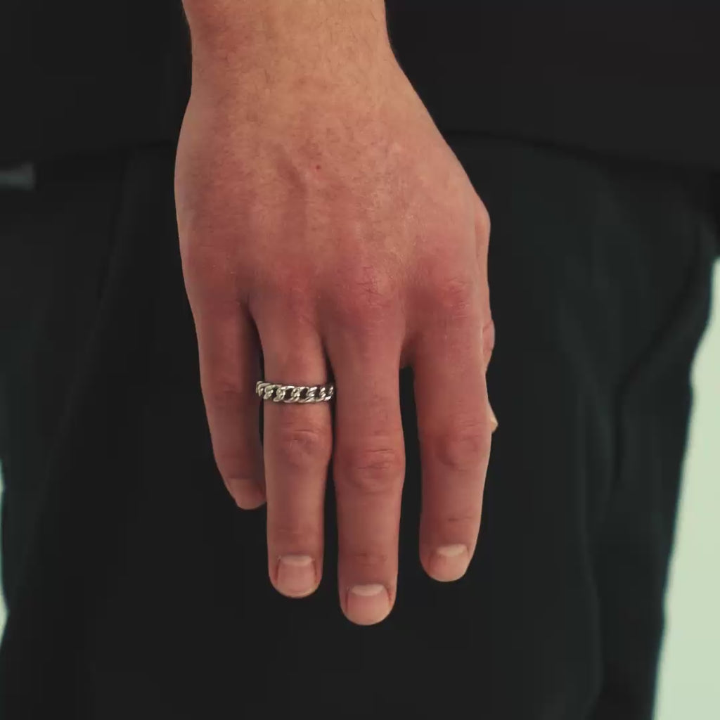 Miami Cuban 5mm Białe Złoto to pierścień inspirowany kultowym splotem łańcucha Cuban Link o szerokości 5 mm. Gęsto połączone ogniwa tworzą zwartą strukturę, która wygląda solidnie i nowocześnie. Chłodny odcień białego złota nadaje mu techniczny, czysty charakter i sprawia, że pasuje do każdej stylizacji.