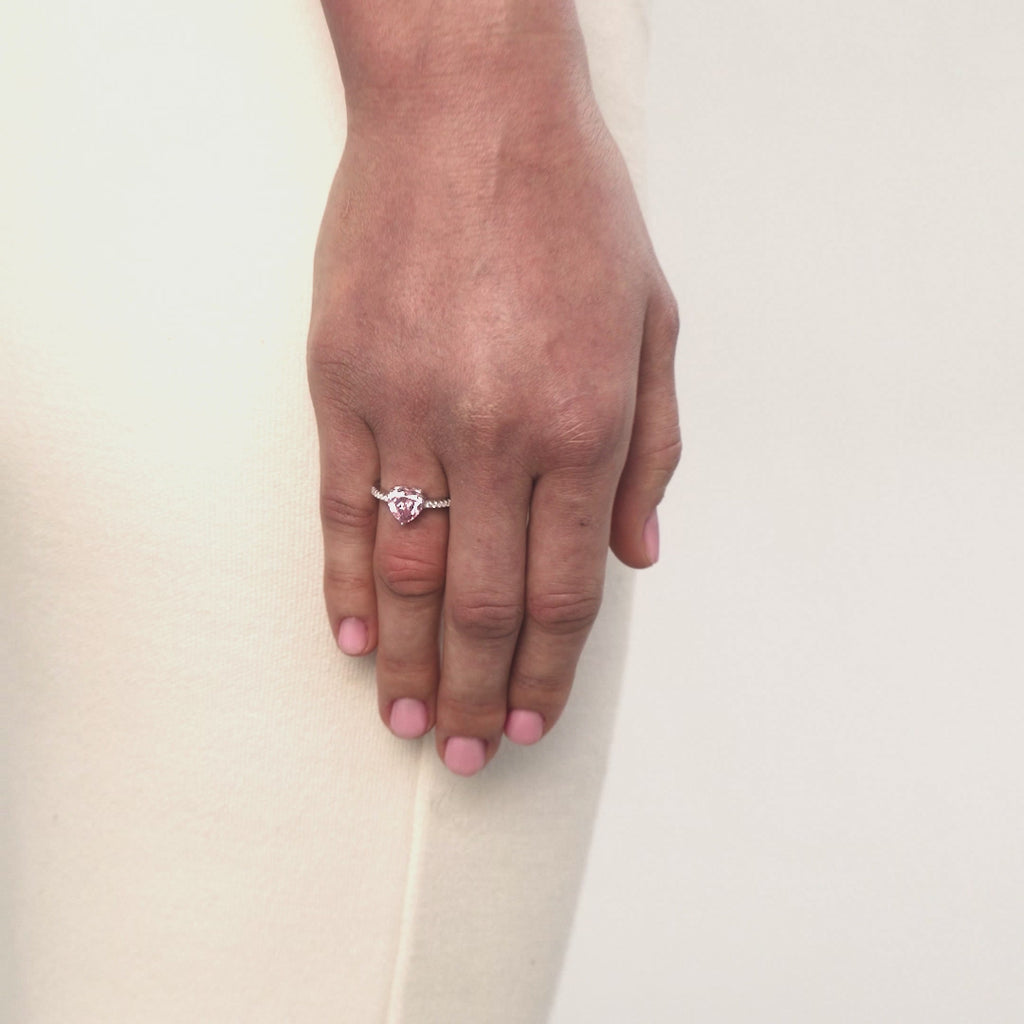 Pierścionek Crystal Heart Pink zachwyca centralnym różowym kryształem IS oszlifowanym w kształt serca, który stanowi wyrazisty symbol miłości i emocji. Precyzyjny szlif kamienia pięknie odbija światło, a delikatne osadzenie podkreśla jego intensywny kolor i nadaje całości eleganckiego charakteru.